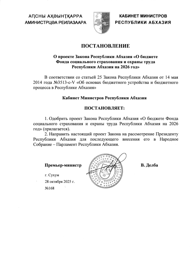 Постановление Кабинета Министров Республики Абхазия от 28.10.2025 №168 "О проекте Закона Республики Абхазия <О бюджете Фонда социального страхования и охраны труда Республики Абхазия на 2026 год>"