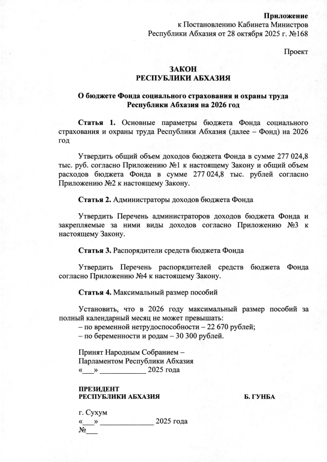 Постановление Кабинета Министров Республики Абхазия от 28.10.2025 №168 "О проекте Закона Республики Абхазия <О бюджете Фонда социального страхования и охраны труда Республики Абхазия на 2026 год>"