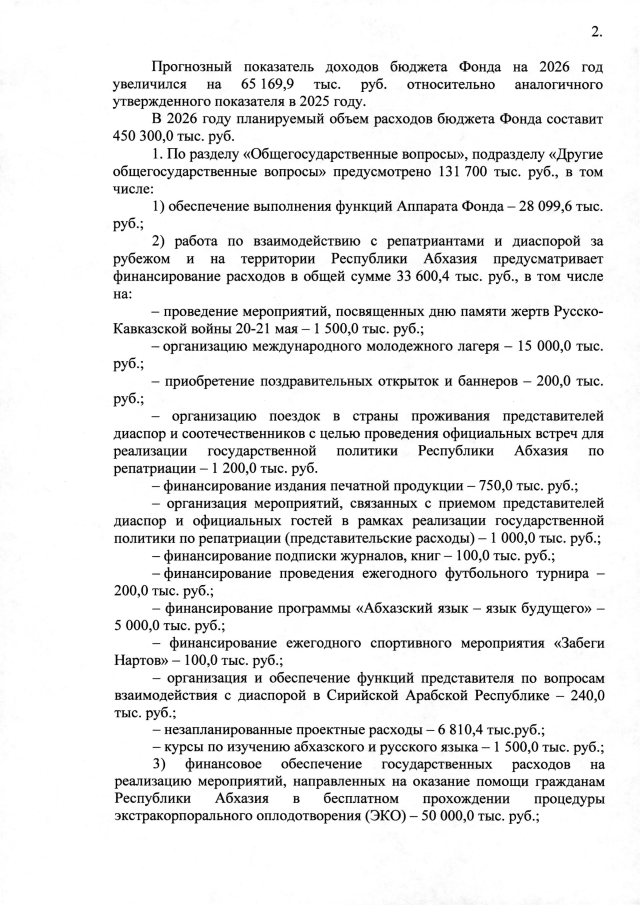Постановление Кабинета Министров Республики Абхазия от 28.10.2025 №169 "О проекте Закона Республики Абхазия <О бюджете Фонда репатриации Республики Абхазия на 2026 год>"