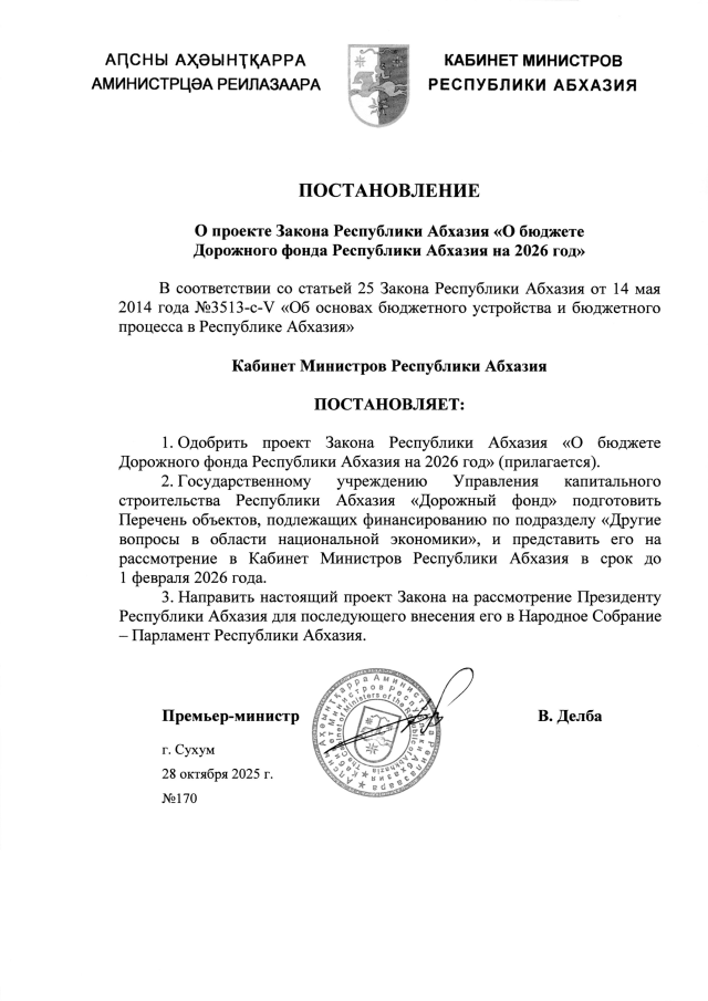 Постановление Кабинета Министров Республики Абхазия от 28.10.2025 №170 "О проекте Закона Республики Абхазия <О бюджете Дорожного фонда Республики Абхазия на 2026 год>"