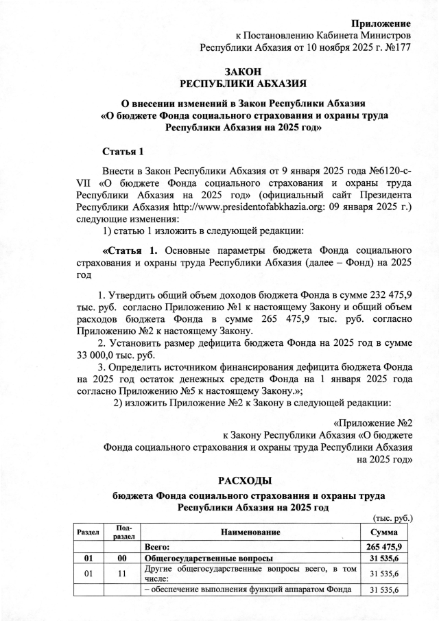 Постановление Кабинета Министров Республики Абхазия от 10.11.2025 №177 "О проекте Закона Республики Абхазия <О внесении изменений в Закон Республики Абхазия <О бюджете Фонда социального страхования и охраны труда Республики Абхазия на 2025 год>"