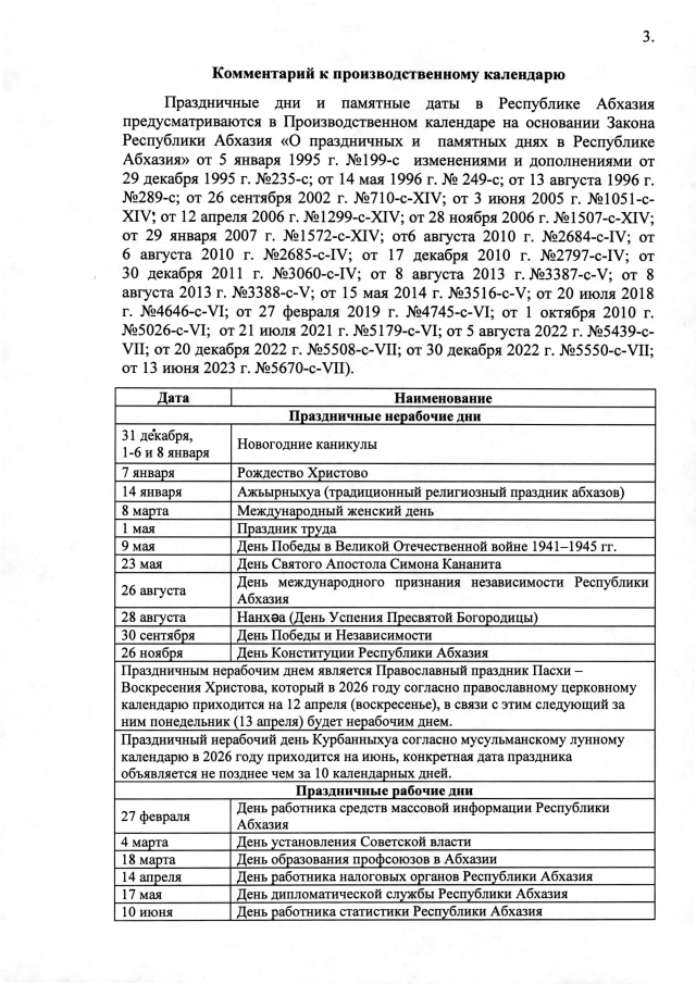 Постановление Кабинета Министров Республики Абхазия от 11.11.2025 №178 "Об утверждении Производственного календаря на 2026 год"