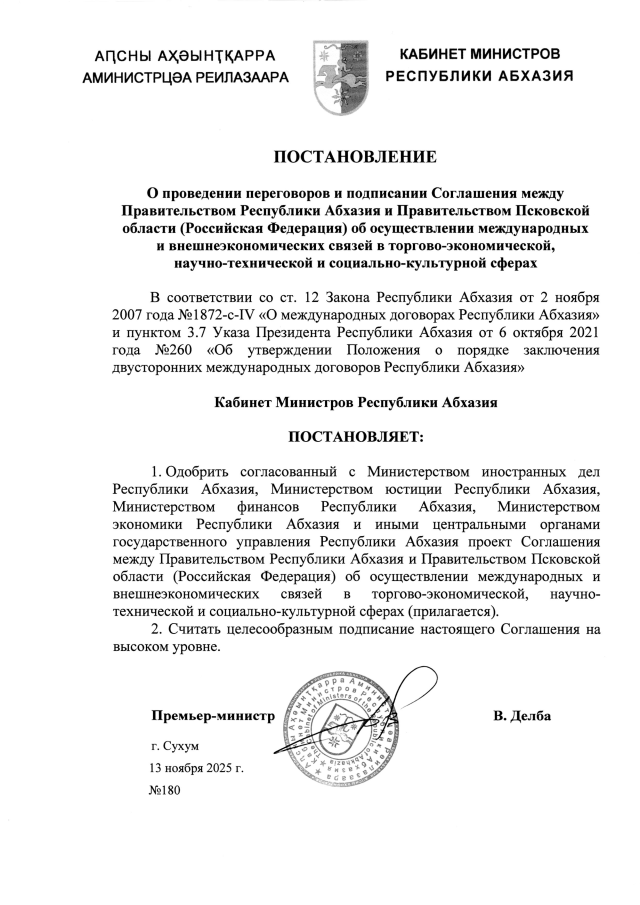 Постановление Кабинета Министров Республики Абхазия от 13.11.2025 №180 "О проведении переговоров и подписании Соглашения между Правительством Республики Абхазия и Правительством Псковской области (Российская Федерация) об осуществлении международных и внешнеэкономических связей в торгово-экономической,научно-технической и социально-культурной сферах"