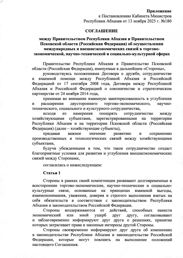 Постановление Кабинета Министров Республики Абхазия от 13.11.2025 №180 "О проведении переговоров и подписании Соглашения между Правительством Республики Абхазия и Правительством Псковской области (Российская Федерация) об осуществлении международных и внешнеэкономических связей в торгово-экономической,научно-технической и социально-культурной сферах"
