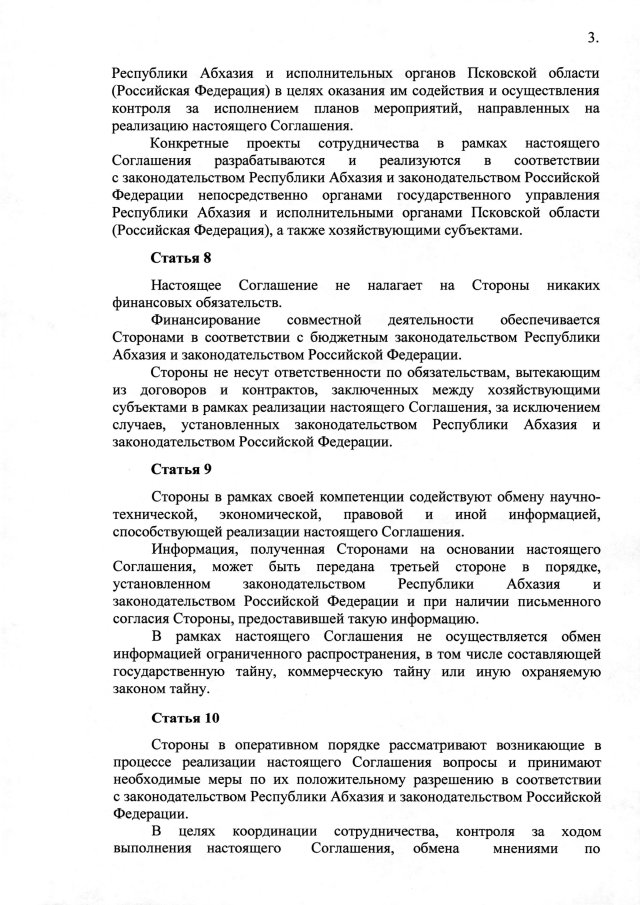 Постановление Кабинета Министров Республики Абхазия от 13.11.2025 №180 "О проведении переговоров и подписании Соглашения между Правительством Республики Абхазия и Правительством Псковской области (Российская Федерация) об осуществлении международных и внешнеэкономических связей в торгово-экономической,научно-технической и социально-культурной сферах"