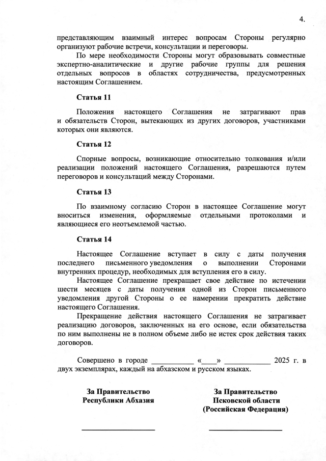 Постановление Кабинета Министров Республики Абхазия от 13.11.2025 №180 "О проведении переговоров и подписании Соглашения между Правительством Республики Абхазия и Правительством Псковской области (Российская Федерация) об осуществлении международных и внешнеэкономических связей в торгово-экономической,научно-технической и социально-культурной сферах"
