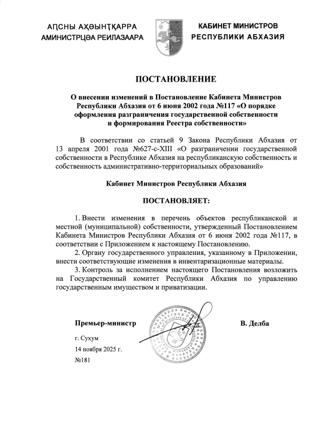 Постановление Кабинета Министров Республики Абхазия от 14.11.2025 №181 "О внесении изменений в Постановление Кабинета Министров Республики Абхазия от 6 июня 2002 года №117 <О порядке оформления разграничения государственной собственности и формирования Реестра собственности>"