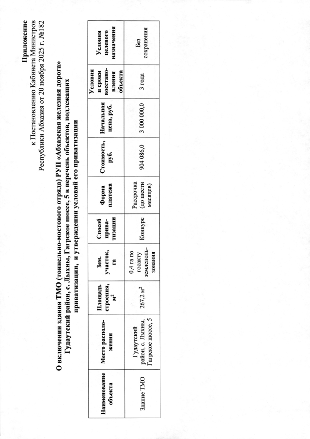 Постановление Кабинета Министров Республики Абхазия от 20.11.2025 №182 "О включении здания ТМО (тоннельно-мостового отряда) РУП <Абхазская железная дорога> (Гудаутский район, с. Лыхны, Гагрское шоссе, 5) в перечень объектов, подлежащих приватизации, и утверждении условий его приватизации"