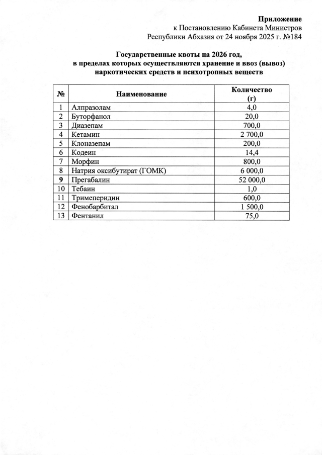 Постановление Кабинета Министров Республики Абхазия от 24.11.2025 №184 "Об установлении государственных квот на 2026 год, в пределах которых осуществляются хранение и ввоз (вывоз) наркотических средств и психотропных веществ"