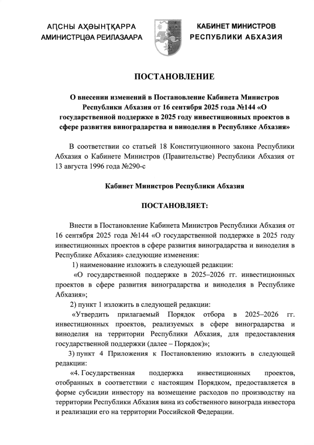 Постановление Кабинета Министров Республики Абхазия от 25.11.2025 №185 "О внесении изменений в Постановление Кабинета Министров Республики Абхазия от 16 сентября 2025 года №144 <О государственной поддержке в 2025 году инвестиционных проектов в сфере развития виноградарства и виноделия в Республике Абхазия>"
