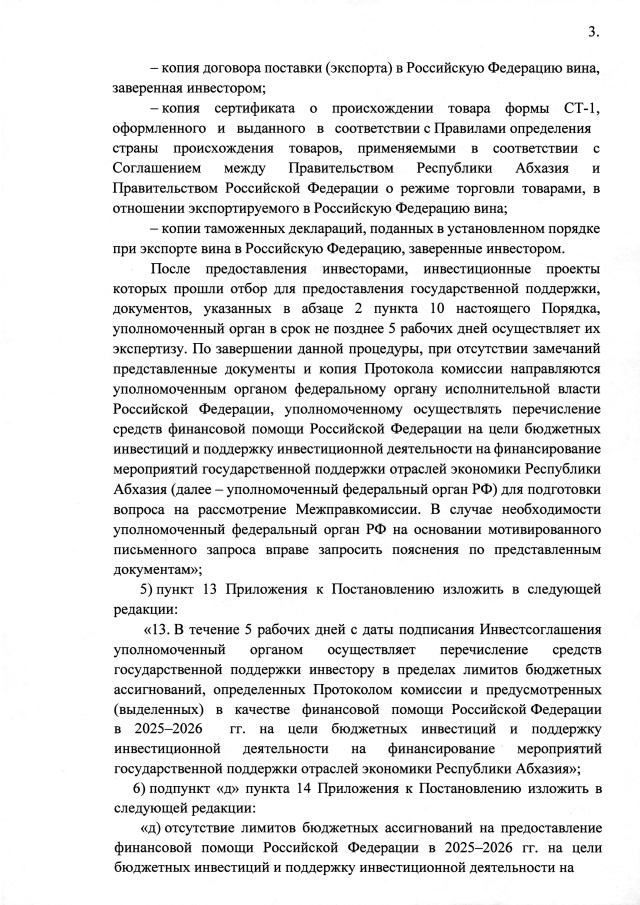 Постановление Кабинета Министров Республики Абхазия от 25.11.2025 №185 "О внесении изменений в Постановление Кабинета Министров Республики Абхазия от 16 сентября 2025 года №144 <О государственной поддержке в 2025 году инвестиционных проектов в сфере развития виноградарства и виноделия в Республике Абхазия>"