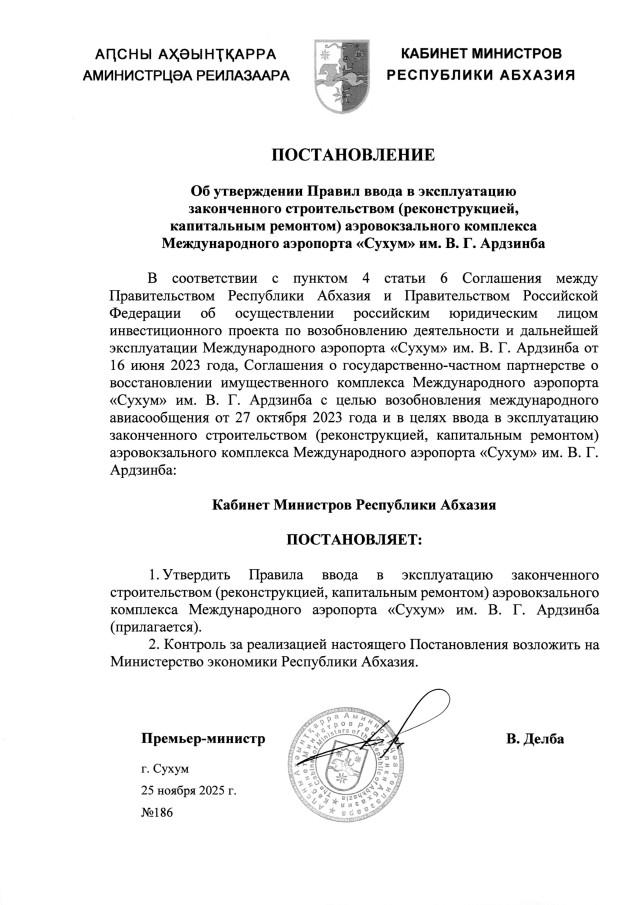 Постановление Кабинета Министров Республики Абхазия от 25.11.2025 №186 "Об утверждении Правил ввода в эксплуатацию законченного строительством (реконструкцией, капитальным ремонтом) аэровокзального комплекса Международного аэропорта <Сухум> им. В. Г. Ардзинба"