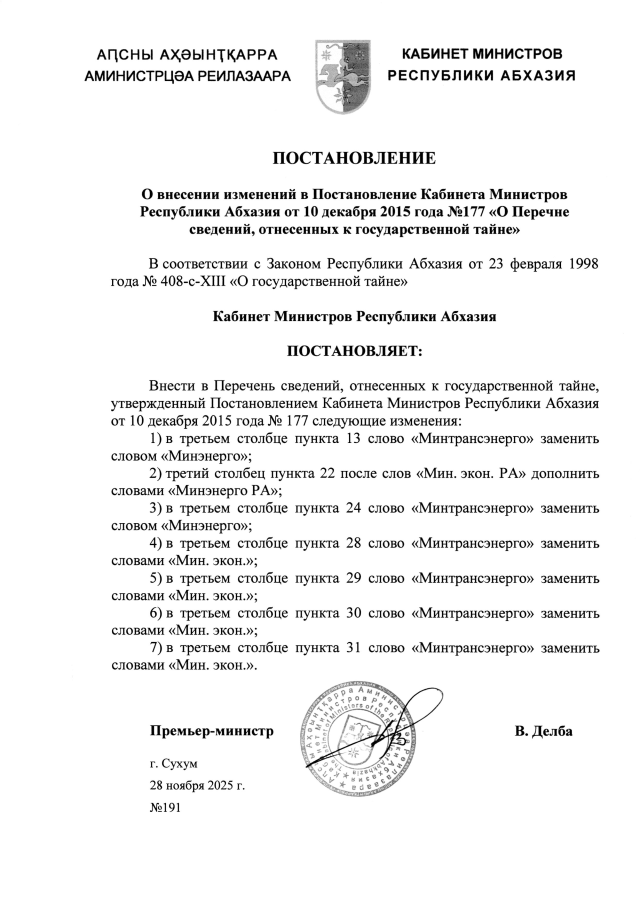 Постановление Кабинета Министров Республики Абхазия от 28.11.2025 №191 "О внесении изменений в Постановление Кабинета Министров Республики Абхазия от 10 декабря 2015 года №177 <О Перечне сведений, отнесенных к государственной тайне>"