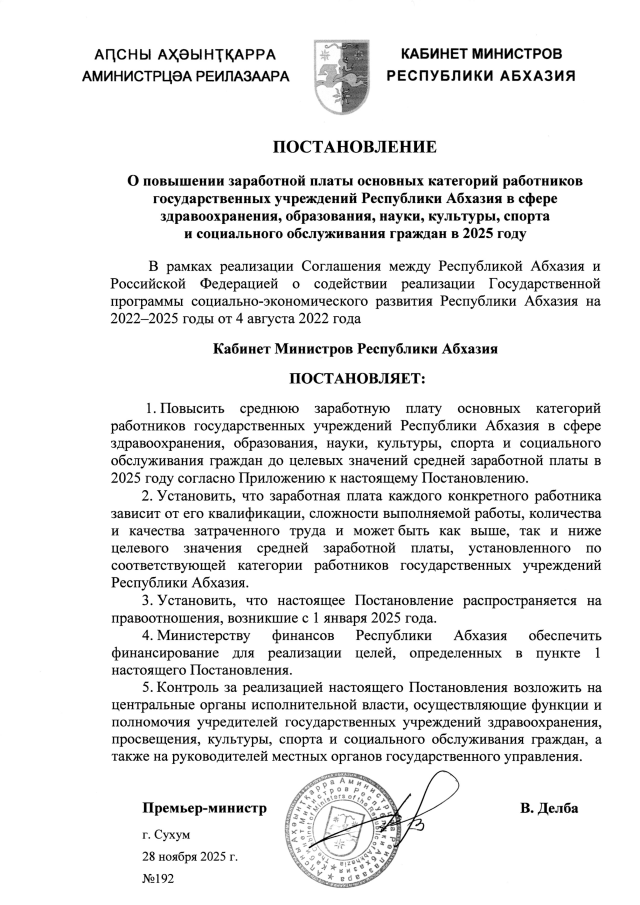 Постановление Кабинета Министров Республики Абхазия от 28.11.2025 №192 "О повышении заработной платы основных категорий работников государственных учреждений Республики Абхазия в сфере здравоохранения, образования, науки, культуры, спорта и социального обслуживания граждан в 2025 году"