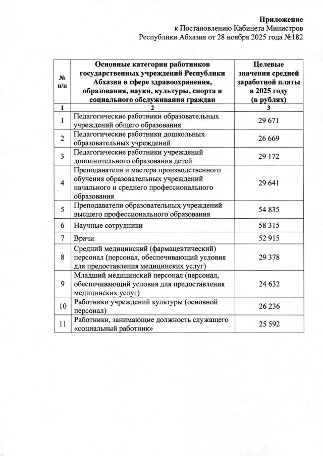 Постановление Кабинета Министров Республики Абхазия от 28.11.2025 №192 "О повышении заработной платы основных категорий работников государственных учреждений Республики Абхазия в сфере здравоохранения, образования, науки, культуры, спорта и социального обслуживания граждан в 2025 году"