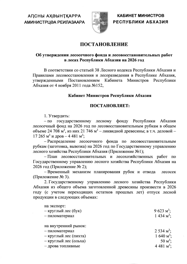 Постановление Кабинета Министров Республики Абхазия от 28.11.2025 №199 "Об утверждении лесосечного фонда и лесовосстановительных работ в лесах Республики Абхазия на 2026 год"