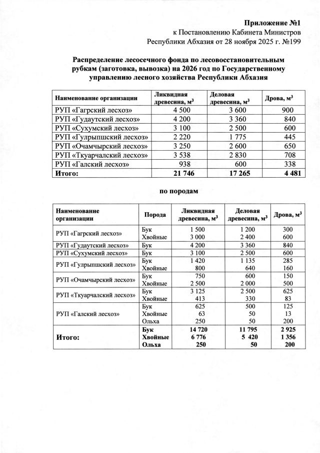 Постановление Кабинета Министров Республики Абхазия от 28.11.2025 №199 "Об утверждении лесосечного фонда и лесовосстановительных работ в лесах Республики Абхазия на 2026 год"