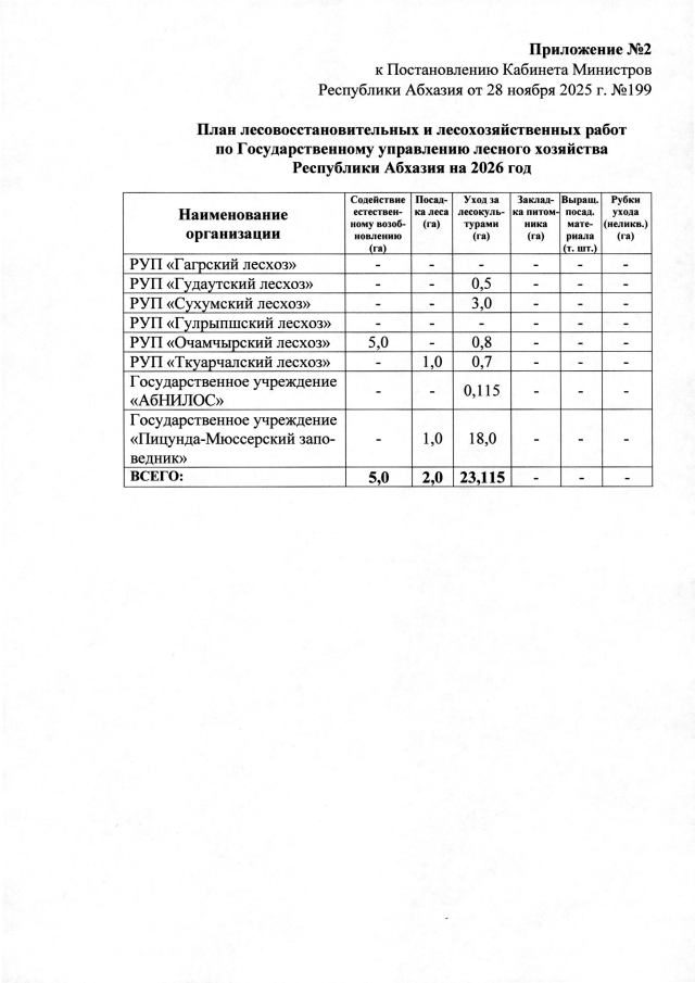Постановление Кабинета Министров Республики Абхазия от 28.11.2025 №199 "Об утверждении лесосечного фонда и лесовосстановительных работ в лесах Республики Абхазия на 2026 год"