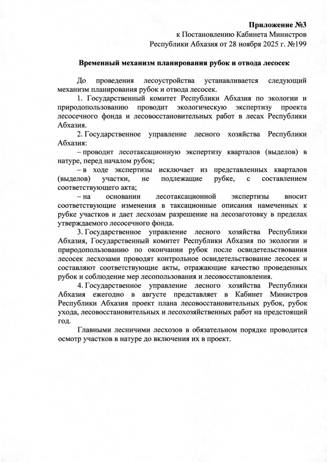 Постановление Кабинета Министров Республики Абхазия от 28.11.2025 №199 "Об утверждении лесосечного фонда и лесовосстановительных работ в лесах Республики Абхазия на 2026 год"