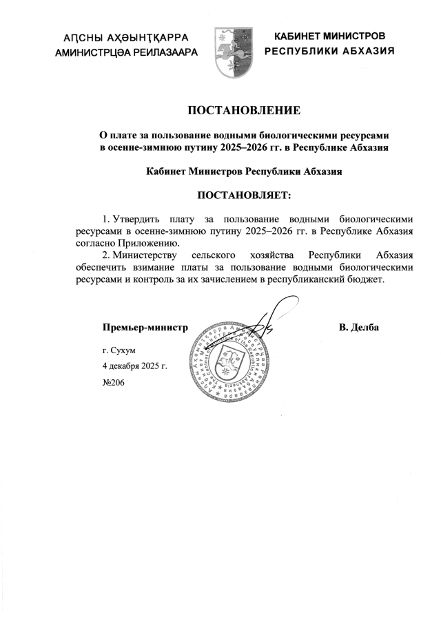 Постановление Кабинета Министров Республики Абхазия от 04.12.2025 №206 "О плате за пользование водными биологическими ресурсами в осенне-зимнюю путину 2025-2026 гг. в Республике Абхазия"