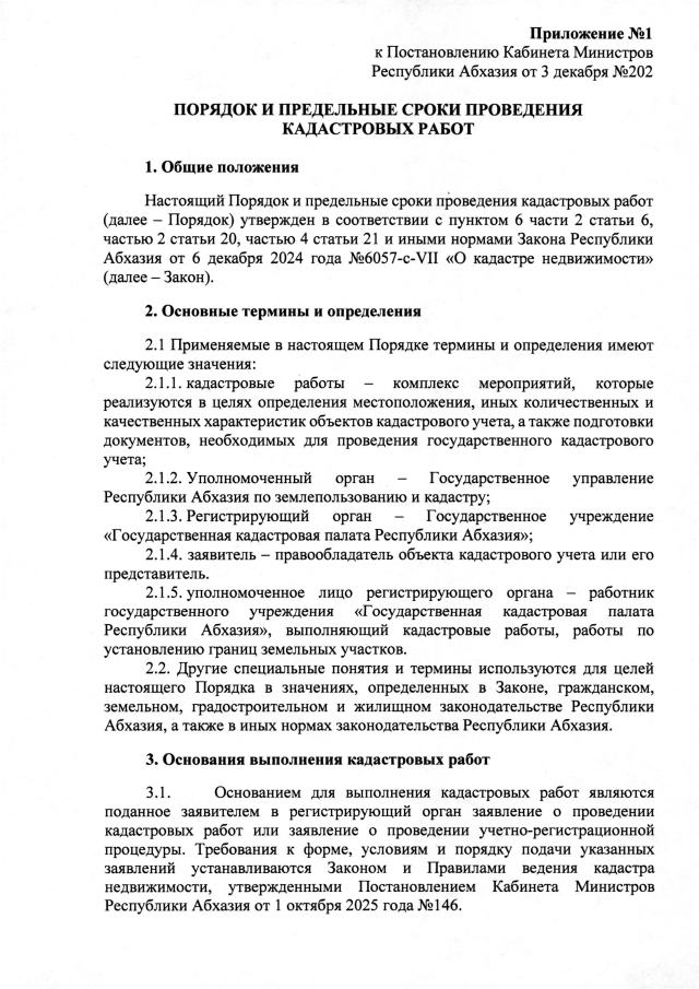 Постановление Кабинета Министров Республики Абхазия от 03.12.2025 №202 "Об утверждении Порядка и предельных сроков проведения кадастровых работ, Порядка и размера взимания платы за услуги, оказываемые государственным учреждением <Государственная кадастровая палата Республики Абхазия>"