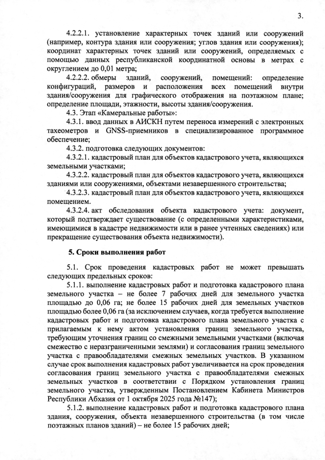Постановление Кабинета Министров Республики Абхазия от 03.12.2025 №202 "Об утверждении Порядка и предельных сроков проведения кадастровых работ, Порядка и размера взимания платы за услуги, оказываемые государственным учреждением <Государственная кадастровая палата Республики Абхазия>"