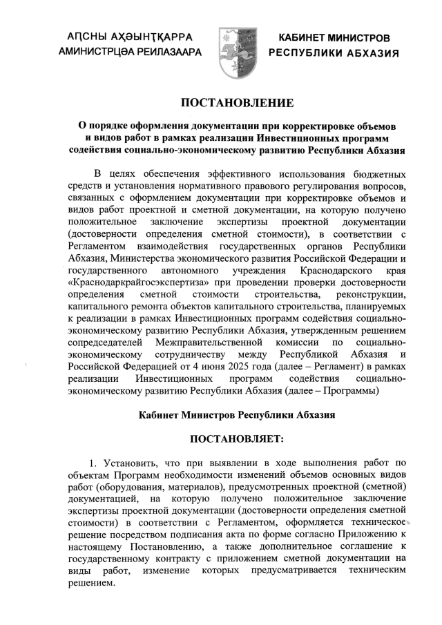 Постановление Кабинета Министров Республики Абхазия от 03.12.2025 №204 "О порядке оформления документации при корректировке объемов и видов работ в рамках реализации Инвестиционных программ содействия социально-экономическому развитию Республики Абхазия"