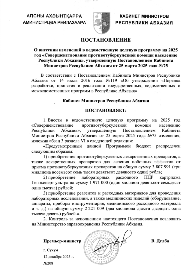 Постановление Кабинета Министров Республики Абхазия от 12.12.2025 №208 "О внесении изменений в ведомственную целевую программу на 2025 год <Совершенствование противотуберкулезной помощи населению Республики Абхазия>, утвержденную Постановлением Кабинета Министров Республики Абхазия от 25 марта 2025 года №75"