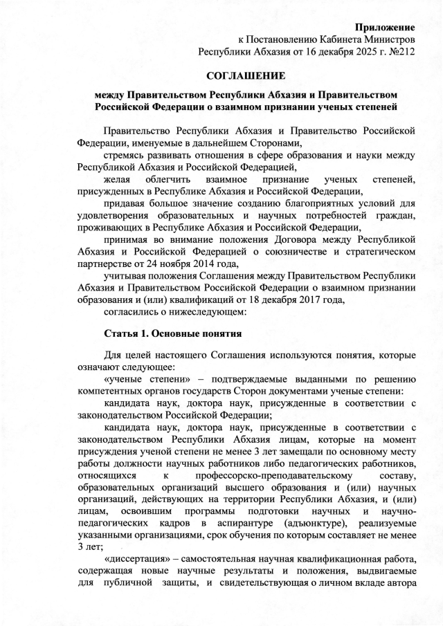 Постановление Кабинета Министров Республики Абхазия от 16.12.2025 №212 "о проведении переговоров и подписании Соглашения между Правительством Республики Абхазия и Правительством Российской Федерации о взаимном признании ученых степеней"