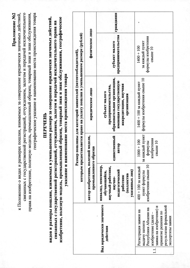 Постановление Кабинета Министров Республики Абхазия от 23.12.2025 №215 "Об утверждении Положения о видах и размерах патентных и иных пошлин, взимаемых за совершение юридически значимых действий, связанных патентом на изобретение, полезную модель, промышленный образец, с государственной регистрацией, отчуждением, залогом и передачей исключительного права на изобретение, промышленный образец, полезную модель, товарный знак и знак обслуживания, географическое указание и наименование места происхождения товара"