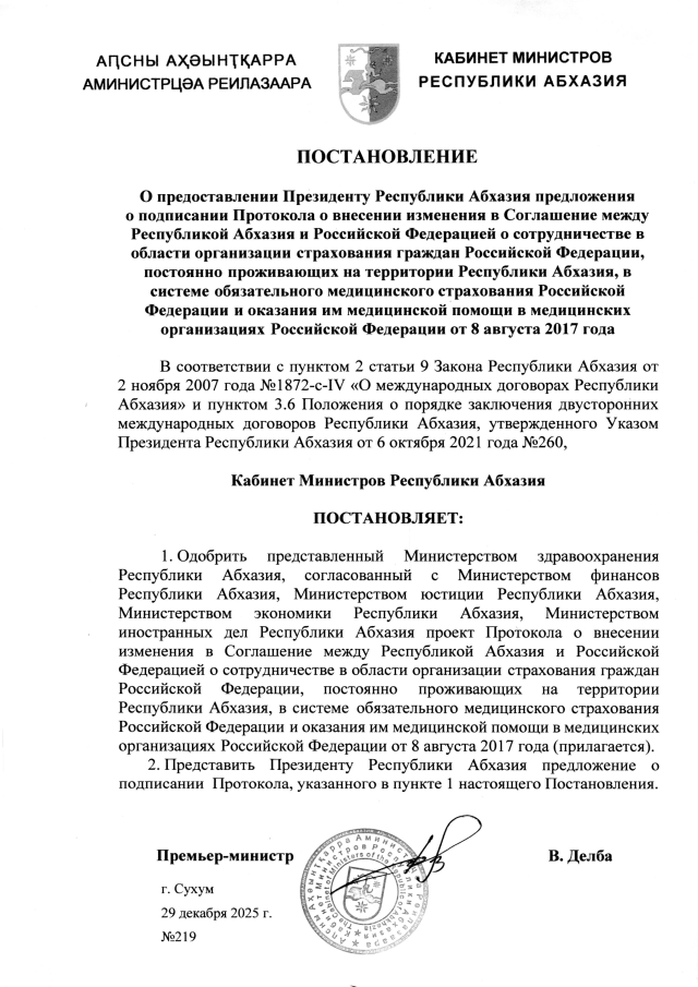 Постановление Кабинета Министров Республики Абхазия от 29.12.2025 №219 "О предоставлении Президенту Республики Абхазия предложения о подписании Протокола о внесении изменения в Соглашение между Республикой Абхазия и Российской Федерацией о сотрудничестве в области организации страхования граждан Российской Федерации, постоянно проживающих на территории Республики Абхазия, в системе обязательного медицинского страхования Российской Федерации и оказания им медицинской помощи в медицинских организациях Российской Федерации от 8 августа 2017 года"