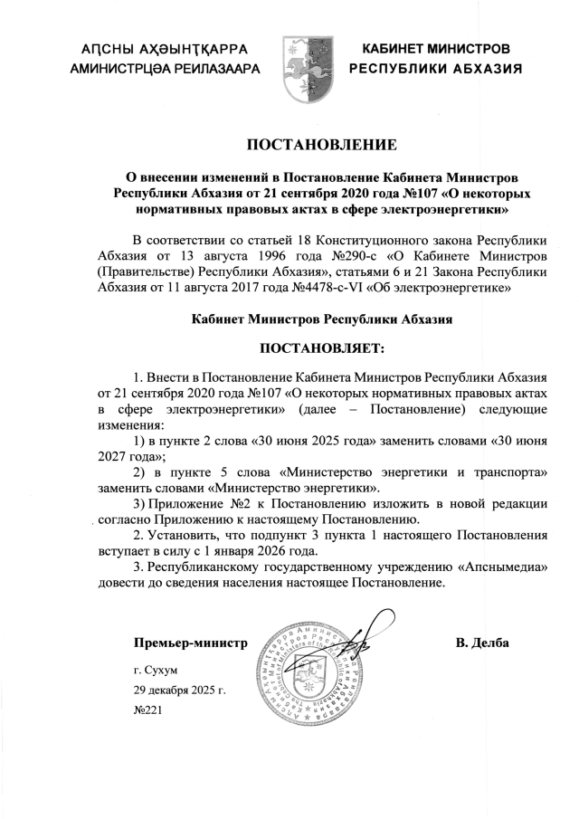 Постановление Кабинета Министров Республики Абхазия от 29.12.2025 №221 "О внесении изменений в Постановление Кабинета Министров Республики Абхазия от 21 сентября 2020 года №107 <О некоторых нормативных правовых актах в сфере электроэнергетики>"