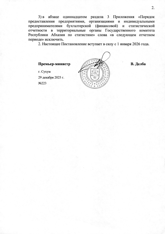 Постановление Кабинета Министров Республики Абхазия от 29.12.2025 №223 "О внесении изменений в Постановление Кабинета Министров Республики Абхазия от 31 октября 2023 года №111 <Об утверждении Порядка предоставления предприятиями, организациями и индивидуальными предпринимателями бухгалтерской (финансовой) и статистической отчетности в территориальные органы Государственного комитета Республики Абхазия по статистике>"