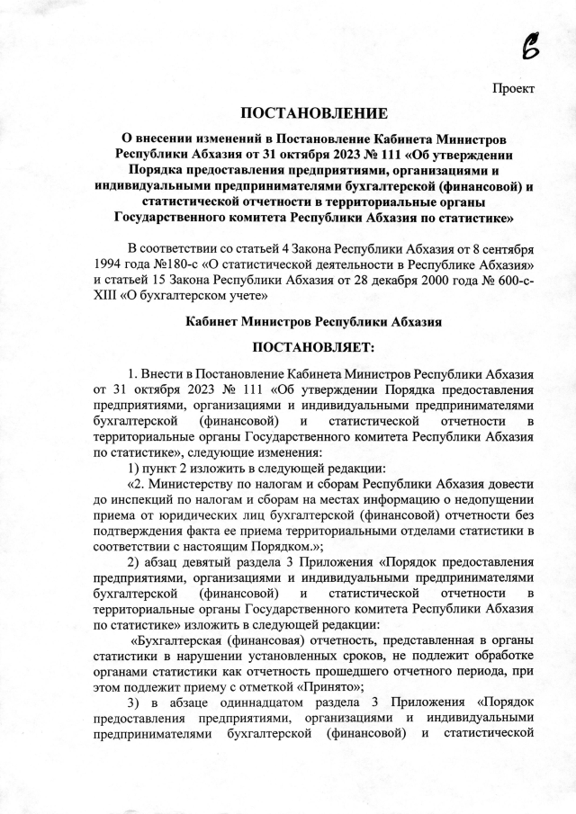 Постановление Кабинета Министров Республики Абхазия от 29.12.2025 №223 "О внесении изменений в Постановление Кабинета Министров Республики Абхазия от 31 октября 2023 года №111 <Об утверждении Порядка предоставления предприятиями, организациями и индивидуальными предпринимателями бухгалтерской (финансовой) и статистической отчетности в территориальные органы Государственного комитета Республики Абхазия по статистике>"