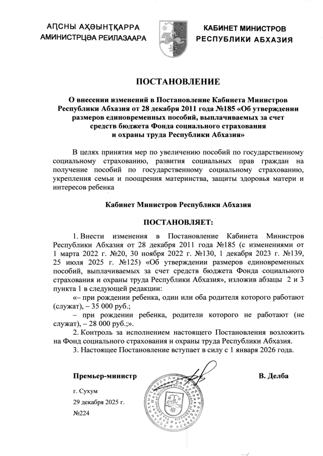 Постановление Кабинета Министров Республики Абхазия от 29.12.2025 №224 "О внесении изменений в Постановление Кабинета Министров Республики Абхазия от 28 декабря 2011 года №185 <Об утверждении размеров единовременных пособий, выплачиваемых за счет средств бюджета Фонда социального страхования и охраны труда Республики Абхазия>"