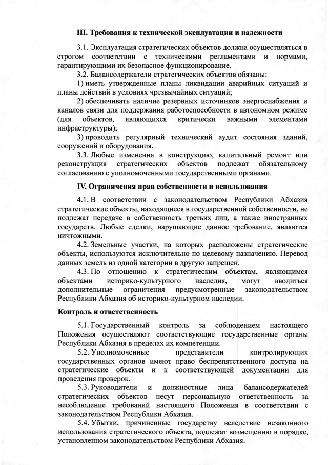 Постановление Кабинета Министров Республики Абхазия от 29.12.2025 №225 "О специальных требованиях к режиму функционирования и эксплуатации стратегических объектов Республики Абхазия"