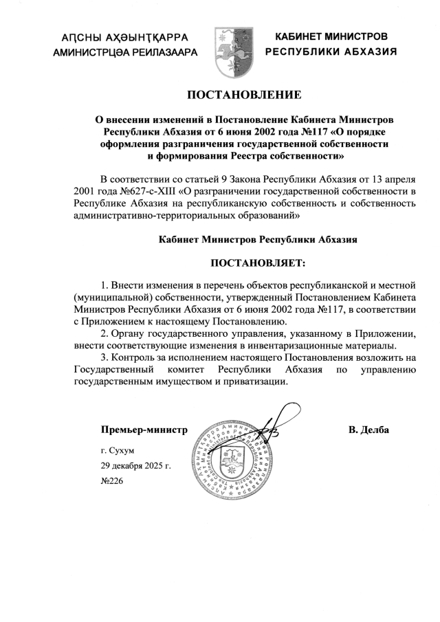 Постановление Кабинета Министров Республики Абхазия от 29.12.2025 №226 "О внесении изменений в Постановление Кабинета Министров Республики Абхазия от 6 июня 2002 года №117 <О порядке оформления разграничения государственной собственности и формирования Реестра собственности>"
