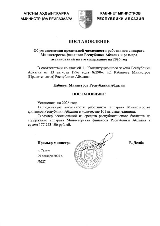 Постановление Кабинета Министров Республики Абхазия от 29.12.2025 №227 "Об установлении предельной численности работников аппарата Министерства финансов Республики Абхазия и размера ассигнований на его содержание на 2026 год"