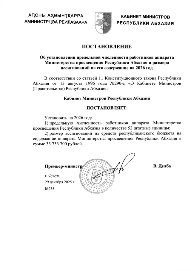 Постановление Кабинета Министров Республики Абхазия от 29.12.2025 №235 "Об установлении предельной численности работников аппарата Министерства просвещения Республики Абхазия и размера ассигнований на его содержание на 2026 год"