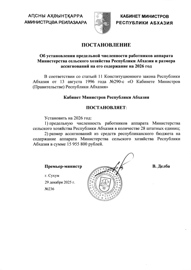 Постановление Кабинета Министров Республики Абхазия от 29.12.2025 №236 "Об установлении предельной численности работников аппарата Министерства сельского хозяйства Республики Абхазия и размера ассигнований на его содержание на 2026 год"