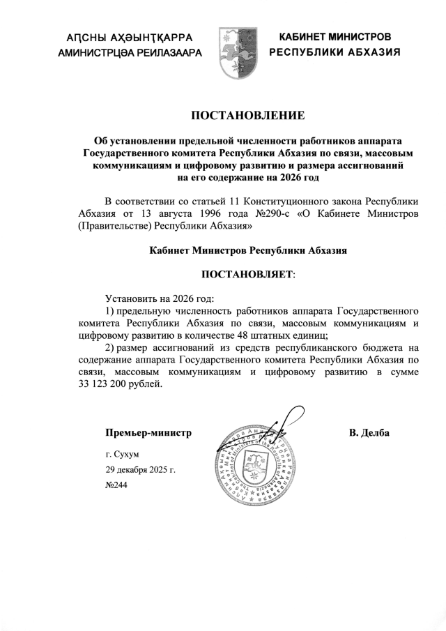 Постановление Кабинета Министров Республики Абхазия от 29.12.2025 №244 "Об установлении предельной численности работников аппарата Государственного комитета Республики Абхазия по связи, массовым коммуникациям и цифровому развитию и размера ассигнований на его содержание на 2026 год"