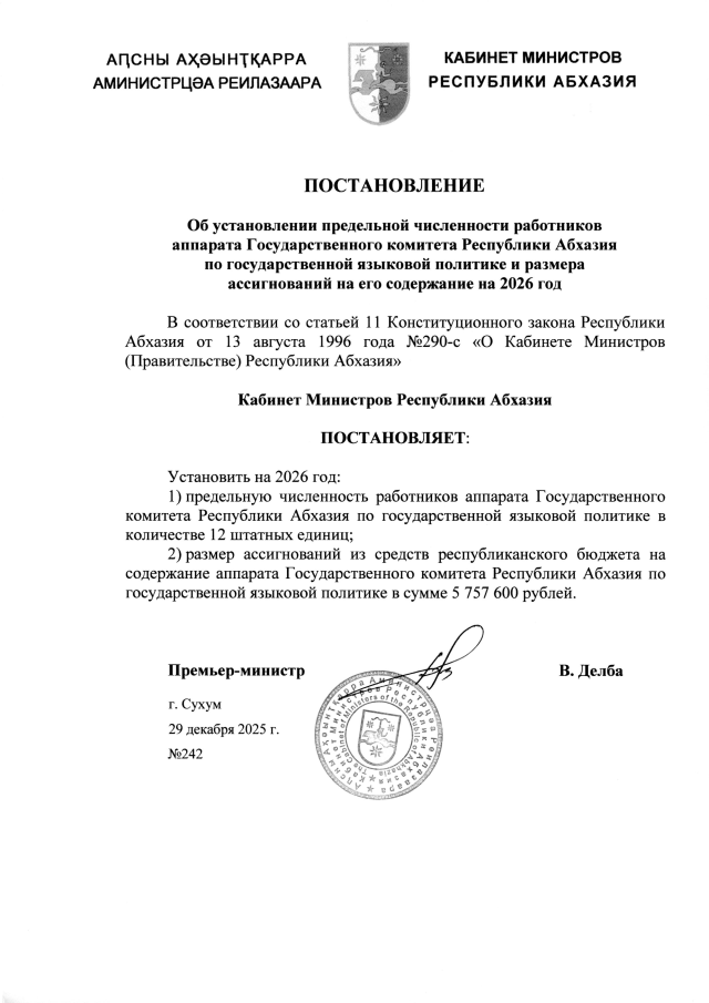 Постановление Кабинета Министров Республики Абхазия от 29.12.2025 №242 "Об установлении предельной численности работников аппарата Государственного комитета Республики Абхазия по государственной языковой политике и размера ассигнований на его содержание на 2026 год"