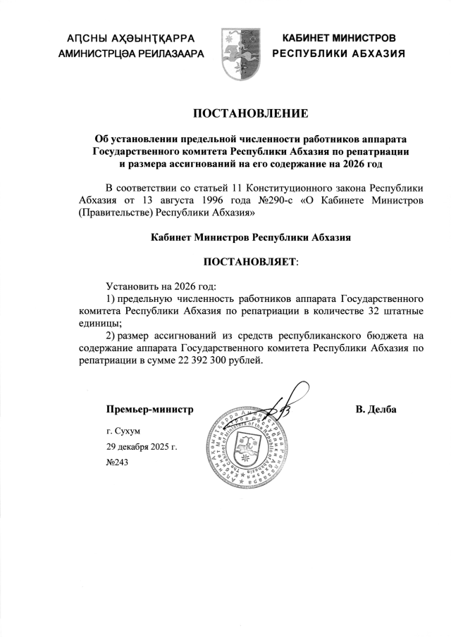 Постановление Кабинета Министров Республики Абхазия от 29.12.2025 №243 "Об установлении предельной численности работников аппарата Государственного комитета Республики Абхазия по репатриации и размера ассигнований на его содержание на 2026 год"