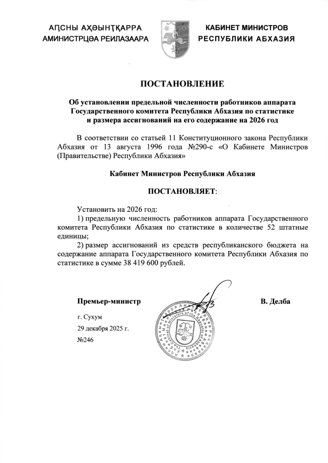 Постановление Кабинета Министров Республики Абхазия от 29.12.2025 №246 "Об установлении предельной численности работников аппарата Государственного комитета Республики Абхазия по статистике и размера ассигнований на его содержание на 2026 год"