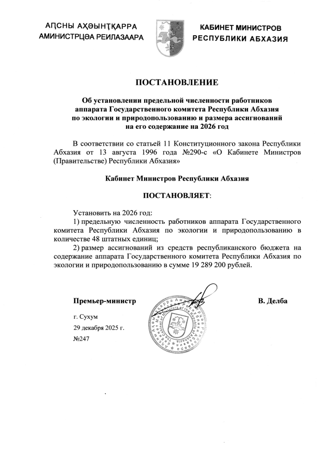 Постановление Кабинета Министров Республики Абхазия от 29.12.2025 №247 "Об установлении предельной численности работников аппарата Государственного комитета Республики Абхазия по экологии и природопользованию и размера ассигнований на его содержание на 2026 год"
