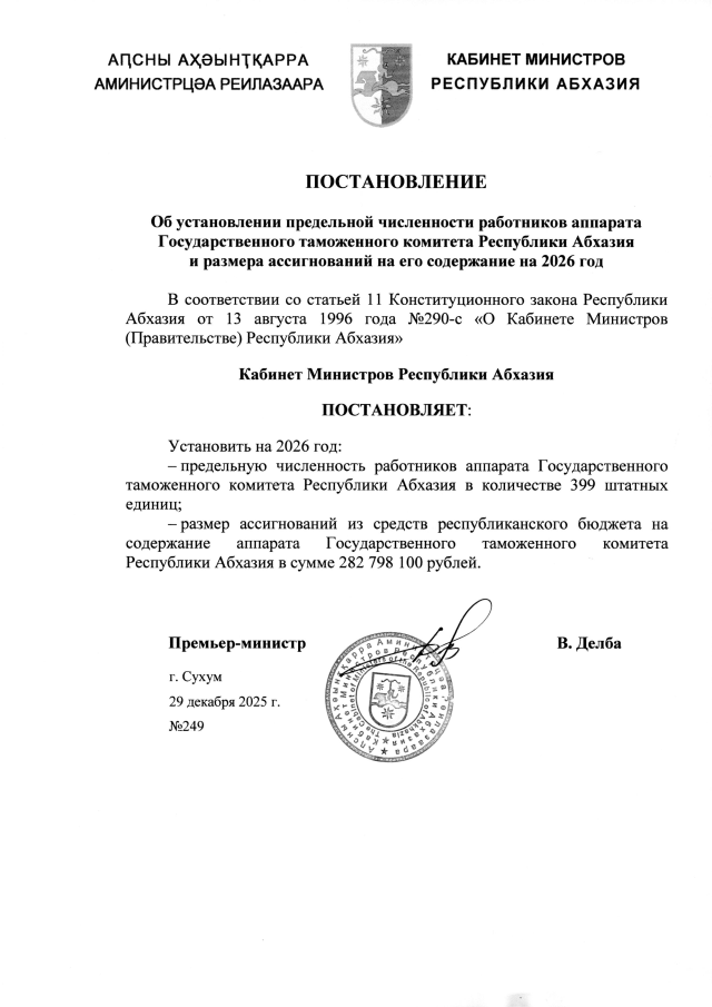 Постановление Кабинета Министров Республики Абхазия от 29.12.2025 №249 "Об установлении предельной численности работников аппарата Государственного таможенного комитета Республики Абхазия и размера ассигнований на его содержание на 2026 год"