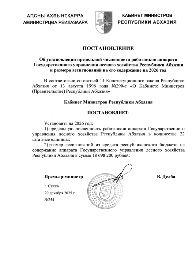 Постановление Кабинета Министров Республики Абхазия от 29.12.2025 №254 "Об установлении предельной численности работников аппарата Государственного управления лесного хозяйства Республики Абхазия и размера ассигнований на его содержание на 2026 год"