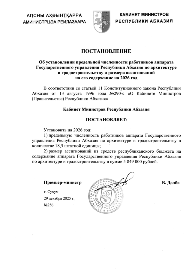 Постановление Кабинета Министров Республики Абхазия от 29.12.2025 №256 "Об установлении предельной численности работников аппарата Государственного управления Республики Абхазия по архитектуре и градостроительству и размера ассигнований на его содержание на 2026 год"