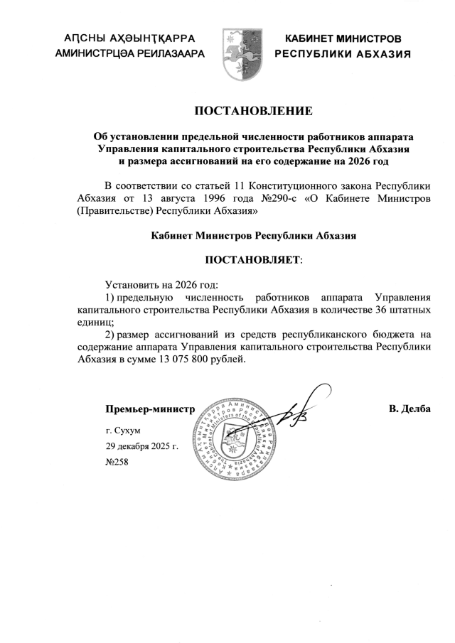 Постановление Кабинета Министров Республики Абхазия от 29.12.2025 №258 "Об установлении предельной численности работников аппарата Управления капитального строительства Республики Абхазия и размера ассигнований на его содержание на 2026 год"