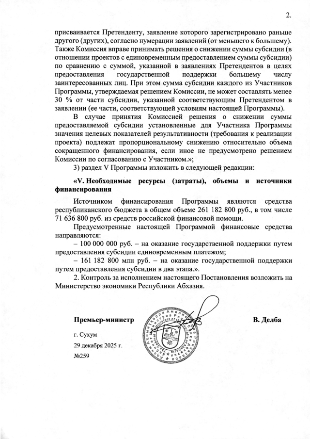 Постановление Кабинета Министров Республики Абхазия от 29.12.2025 №259 "О внесении изменений в Постановление Кабинета Министров Республики Абхазия от 14 марта 2025 года №23 <Об утверждении ведомственной краткосрочной целевой Программы <Поддержка малого и среднего предпринимательства в Республике Абхазия на 2025 год>"